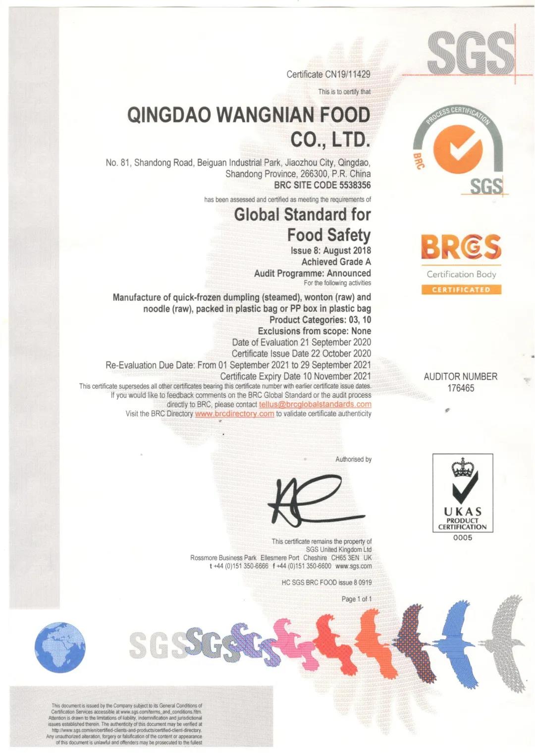 青島旺年食品有限公司榮獲BRC食品安全全球標準A級認證