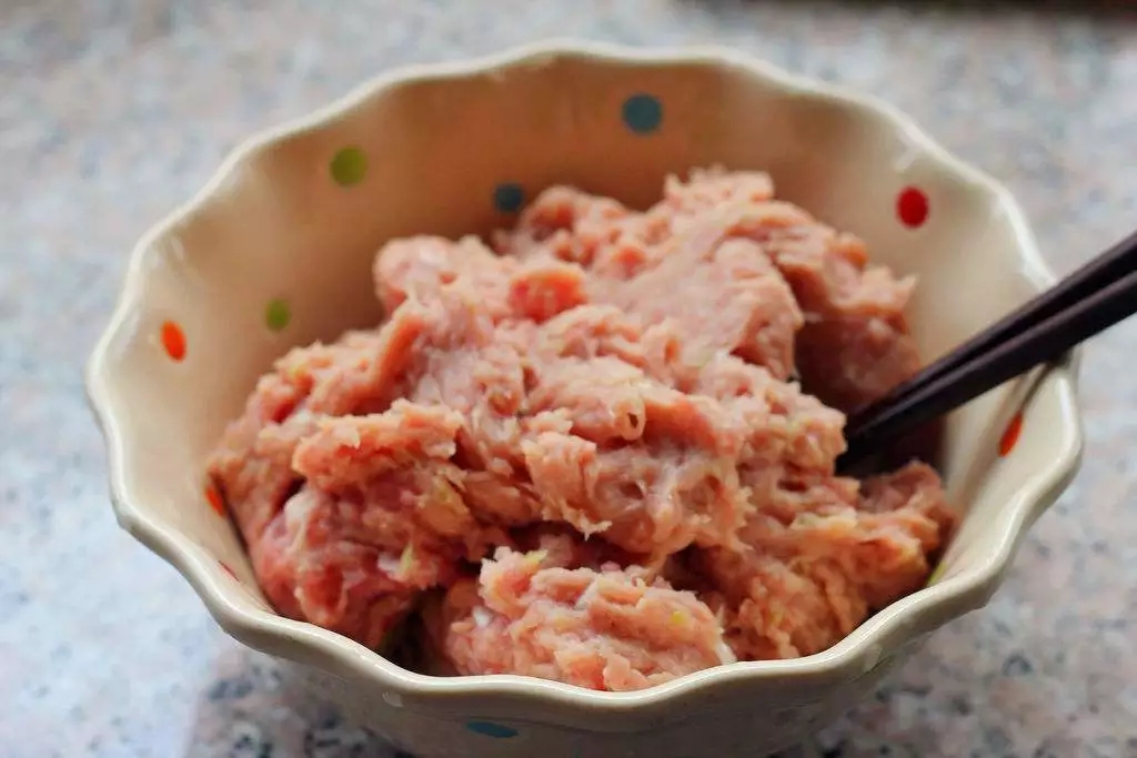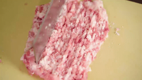 你會發(fā)現(xiàn),剁好之后的肉餡,跟沒剁的肉餡有一定的區(qū)別:剁好后肉餡會很有彈性!